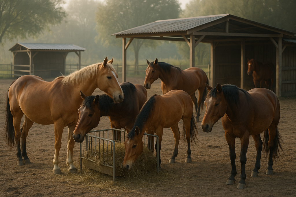 Pferde leben draußen im Herdenverband, mit Unterstand, Heuraufen und oft ganzjährig auf Paddock/Weide.